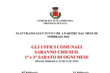 Si avvisano gli utenti che a partire dal mese di febbraio 2026 gli Uffici Comunali saranno chiusi il 1° e 3° sabato di ogni mese ...