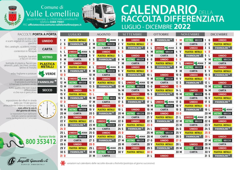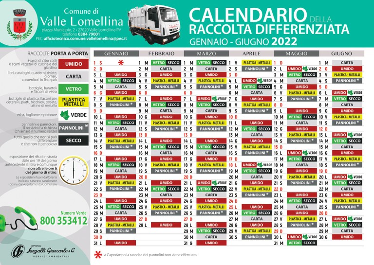 Descrizione Calendario raccolta differenziata anno 2022 Allegati Documenti Calendario raccolta rifiuti (Gennaio - Giugno) [.jpg 186,78 Kb - 25/03/2022] Calendario raccolta rifiuti (Luglio - Dicembre) [.jpg 189,71 Kb - 25/03/2022] A cura di Relazioni con il Pubblico Ultimo aggiornamento pagina: 25/03/2022 09:15:19