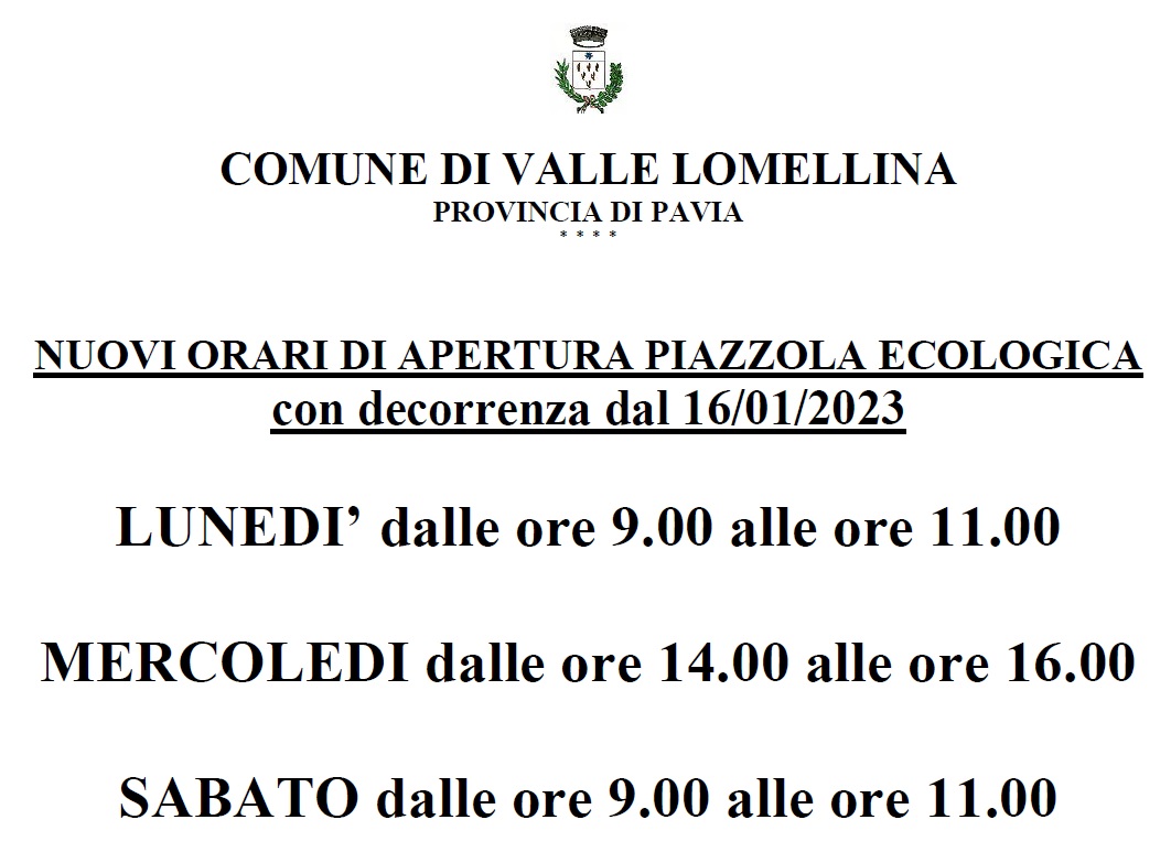 Descrizione Nuovo orario piazzola ecologica Allegati Documenti decreto 6-2023 nuovi orari piazzola ecologica [.pdf 246,33 Kb - 12/01/2023] A cura di Relazioni con il Pubblico Ultimo aggiornamento pagina: 12/01/2023 08:36:01
