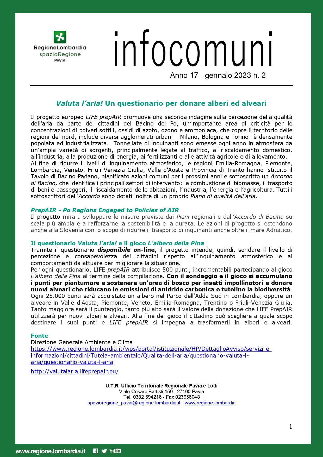 Descrizione Valuta l’aria! Un questionario per donare alberi ed alveari Allegati Documenti avviso [.pdf 182,63 Kb - 20/01/2023] Link pagina di Regione Lombardia (Apre il link in una nuova scheda) questionario (Apre il link in una nuova scheda) A cura di Relazioni con il Pubblico Ultimo aggiornamento pagina: 20/01/2023 08:43:01