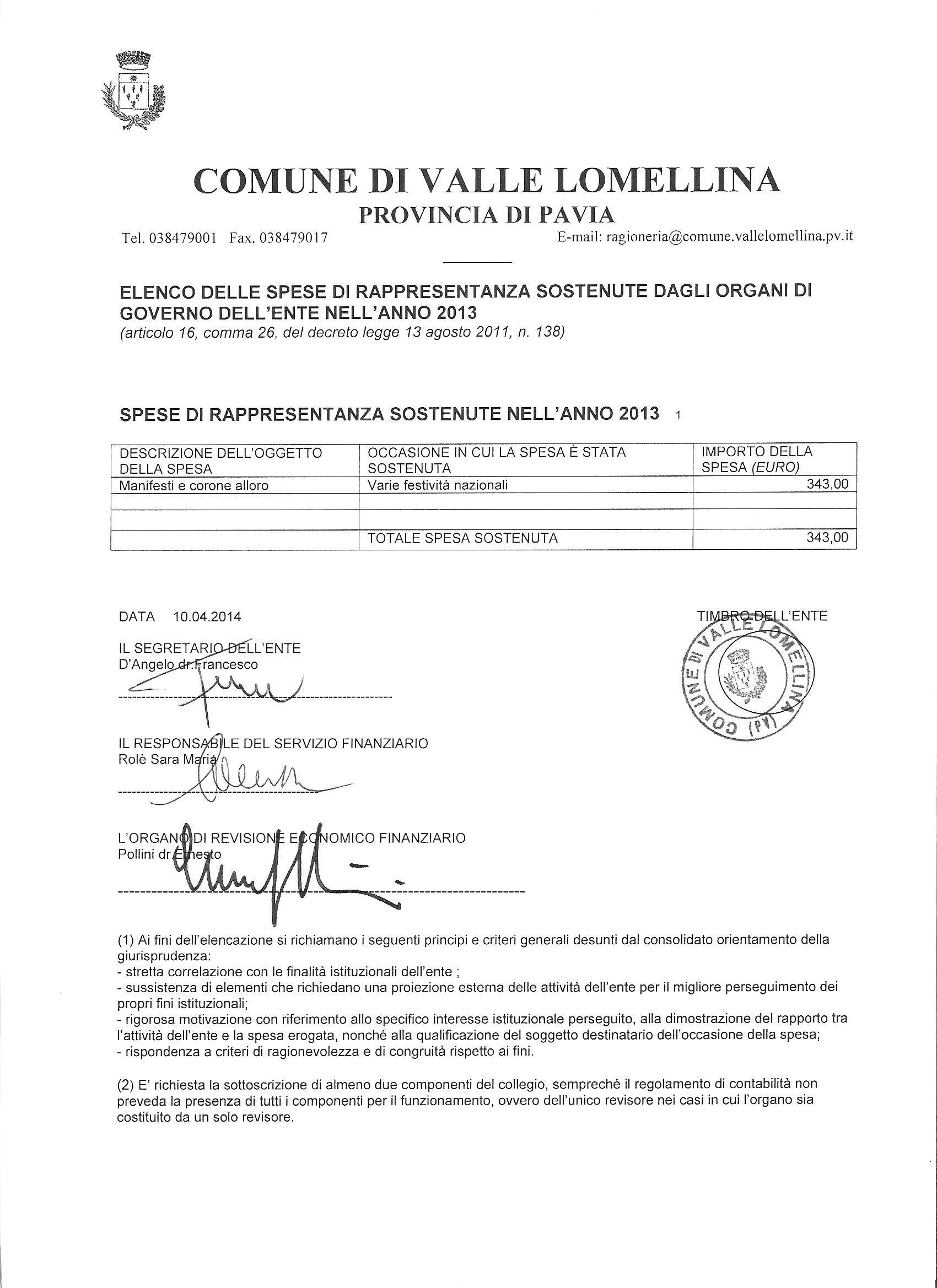 Spese di rappresentanza - Anno 2013