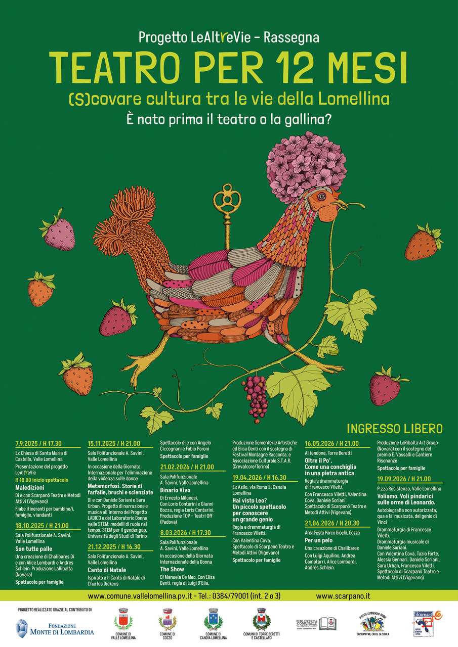 - Stagione teatrale itinerante tra i Comuni coinvolti progettata per avere come fruitori spettatori e spettatrici di ogni età